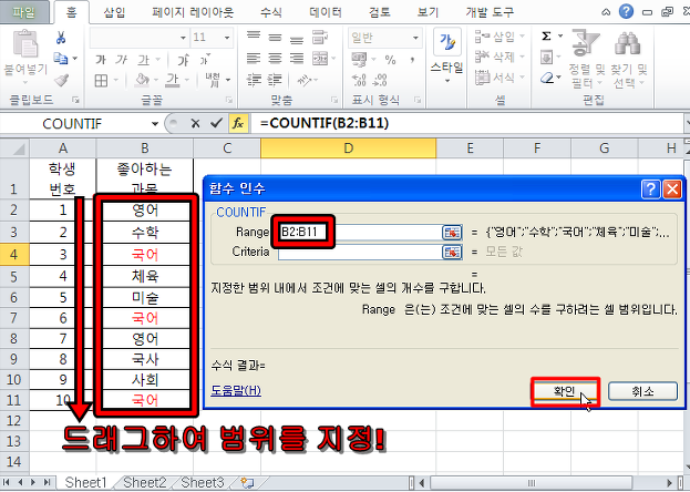 3. 그리고 조건에 "국어"를 입력하고 확인을 누릅니다.
