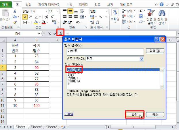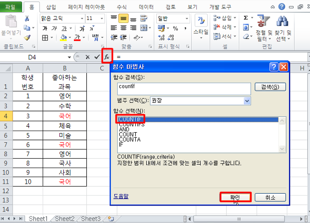 1. 함수버튼 fx를 클릭하여 COUNIF 함수를 선택해 줍니다.