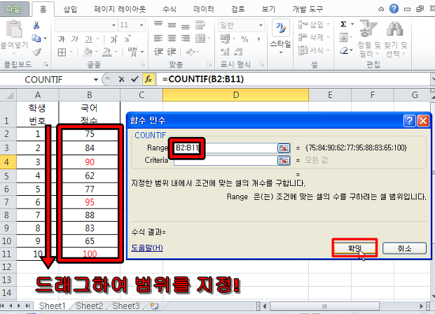 그리고 두번째로 90점 이상인 점수를 세어 볼까요???!