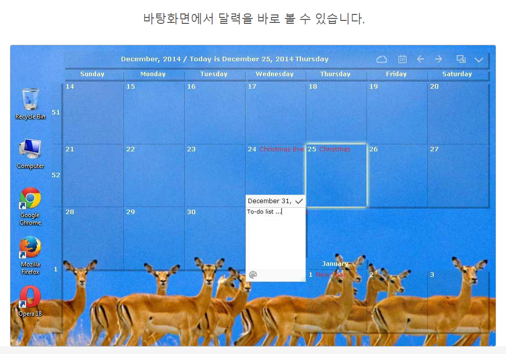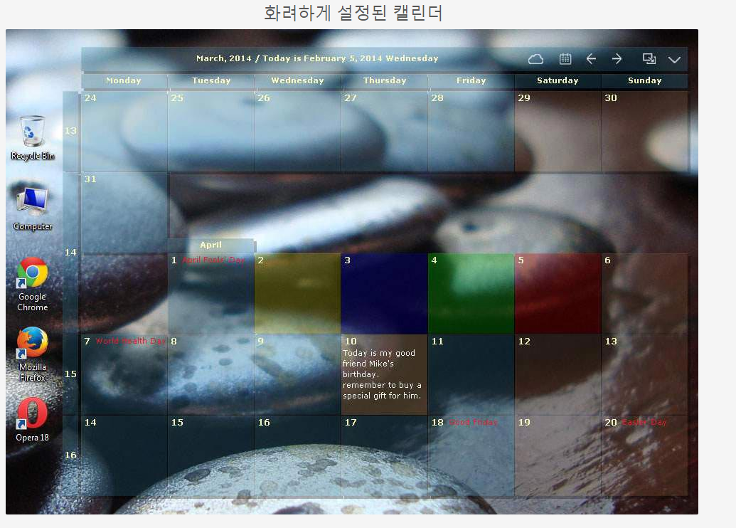 설치가 완료되면 위와 같이 반투명한 달력위젯이 바탕화면에 나타나는데요!